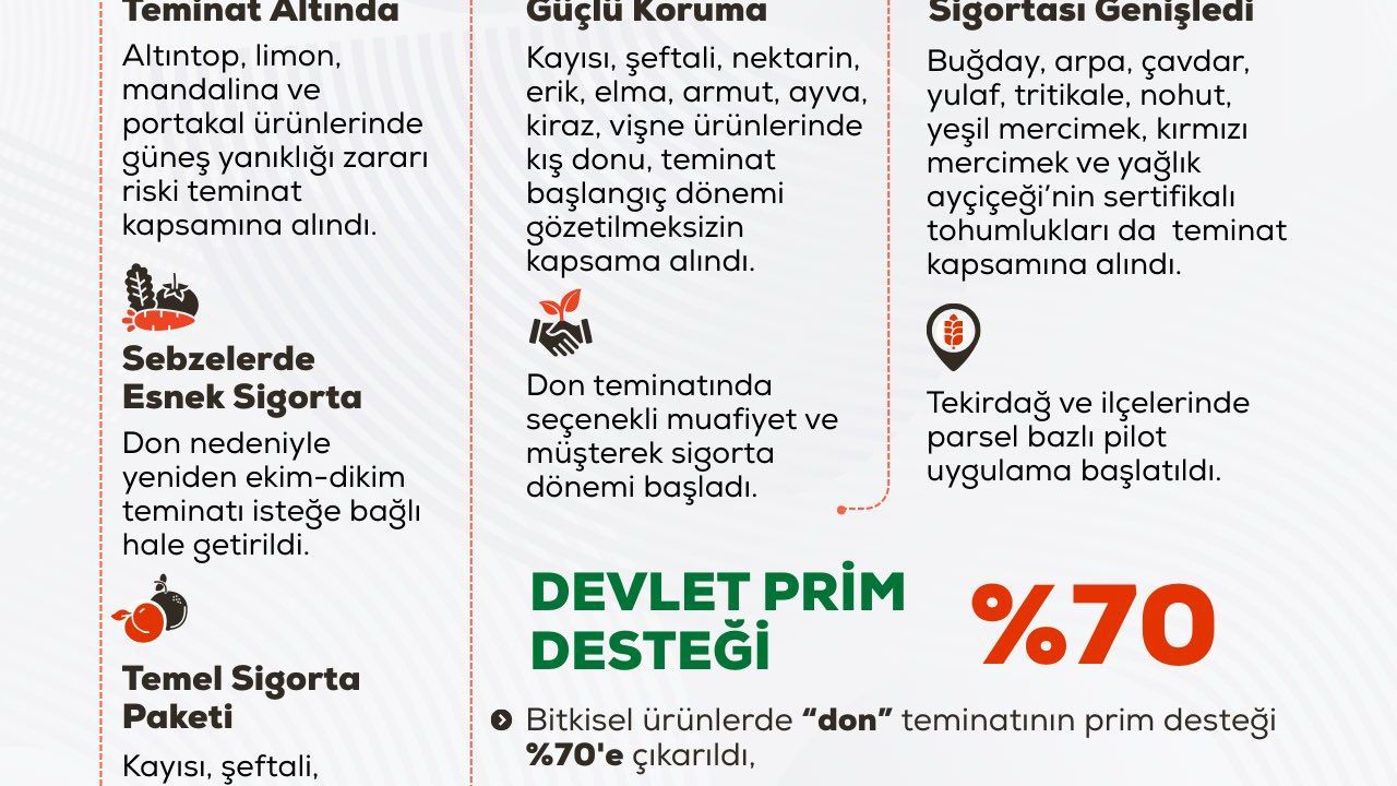 Tarım ve Orman Bakanlığı, tarım sigortalarında kapsamı genişleten ve üreticiyi doğal afetlere karşı daha güçlü korumayı hedefleyen yeni uygulamaları hayata geçirdi. Özellikle don riski başta olmak üzere birçok yeni risk teminat kapsamına alınırken, devlet prim desteği yüzde 70’e çıkarıldı.