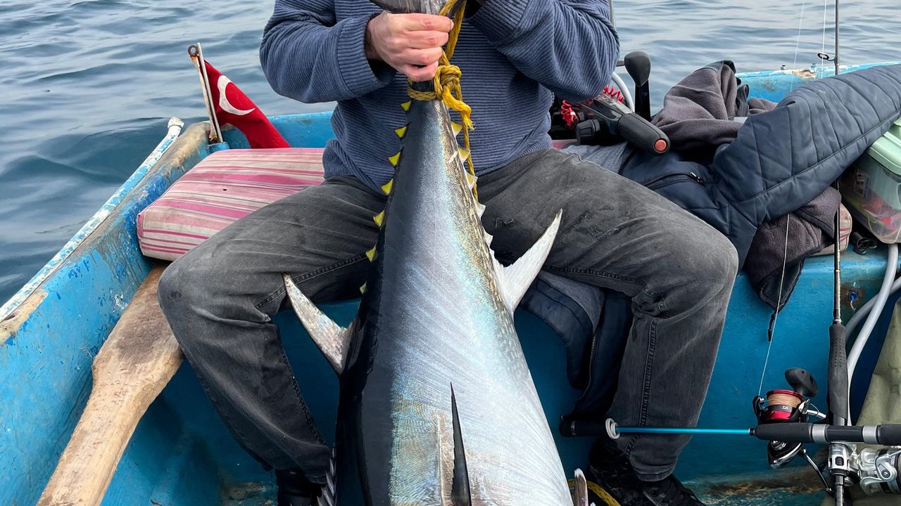 İskenderun Körfezi’nde 4 buçuk metrelik teknesiyle hobi amaçlı denize açılan öğretmen Murat Çengel, oltasına takılan devasa balıkla hayatının heyecanını yaşadı. Yaklaşık 2 saat süren zorlu uğraşın ardından 1 buçuk metre uzunluğunda ve 60 kilogram ağırlığında bir orkinosu tekneye çıkarmayı başaran Çengel, o anları büyük bir coşkuyla sosyal medyada paylaştı.