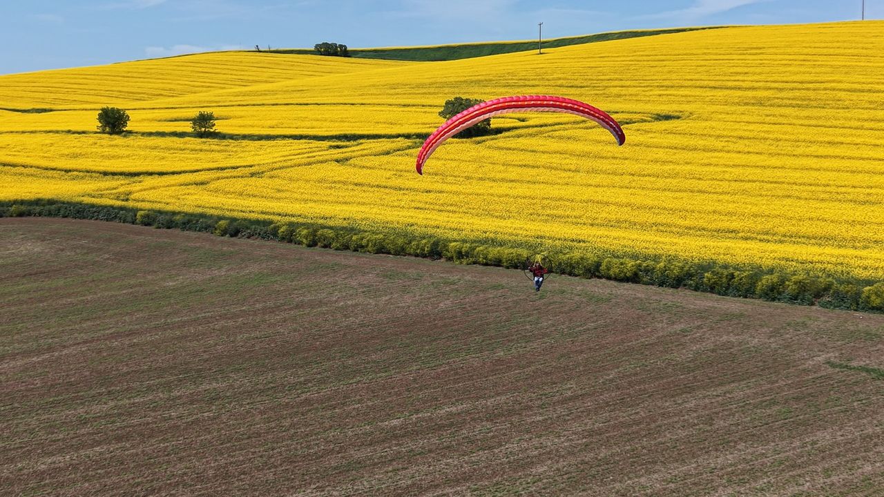 Tekirdağlı paraşüt eğitmeni Kadir Aksoy, bölgenin tarımsal zenginliğine ve doğa turizmine dikkat çekmek amacıyla Süleymanpaşa ilçesinde havalandı. Gaziköy Mahallesi'nde hazırlıklarını tamamlayan Aksoy, paramotoruyla gökyüzüne yükselerek Tekirdağ'ın sarı ve yeşil tonlara bürünen eşsiz coğrafyasını keşfe çıktı.